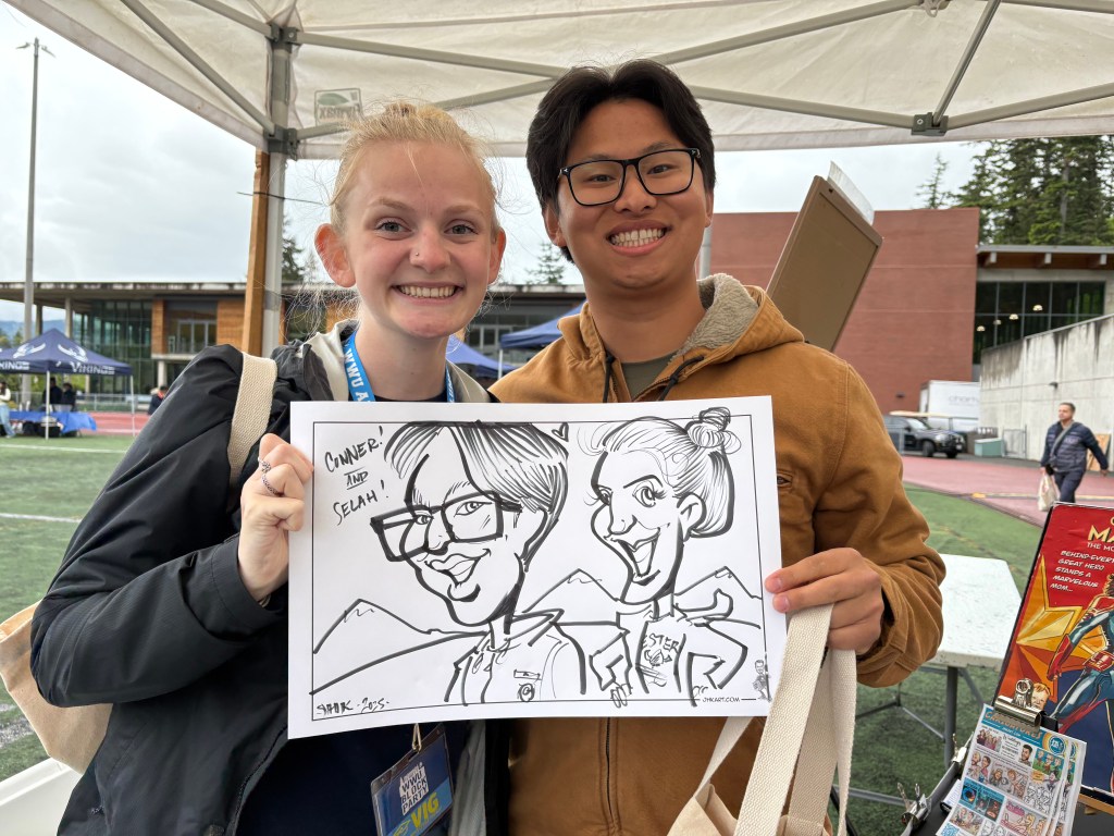 I charge $150 an hour (2 hour minimum) for caricature entertainment, giving the drawings away free to your guests at an event you are hosting. Travel costs apply for events outside of Whatcom County. I charge $200 an hour for weddings. I am able to draw 15-20 guests per hour. Usually I stick to black and white for such events. If there is a lower number of guests, color can be provided but color usually doubles the time it takes so fewer guests would get drawn. To book me for an event, make a date and time request below. If I’m available, a deposit of $150 is required to book my services.